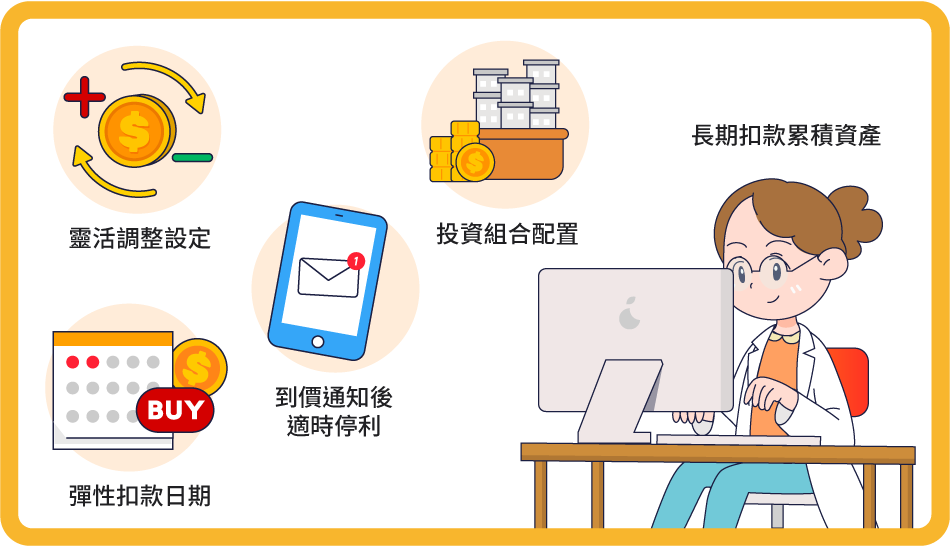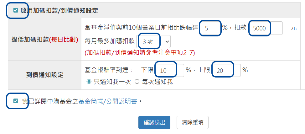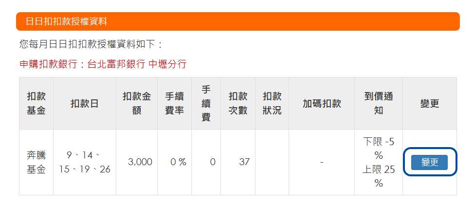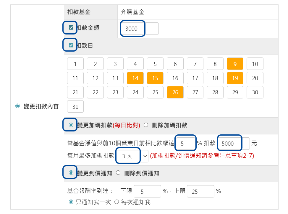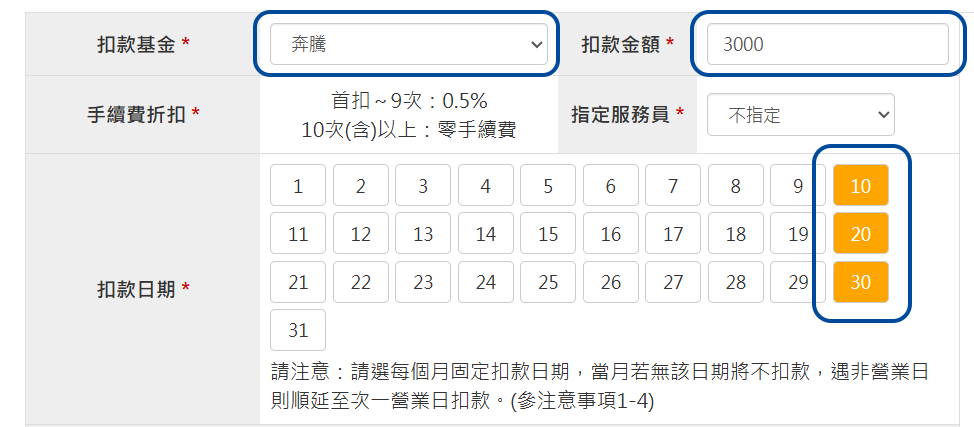 註1、遇無29、30或31日之月份,該月將不扣款;2、與單筆申購帳號相同;3、營業日當日下午4:00前委託完成的申購或變更,次一營業日即可生效