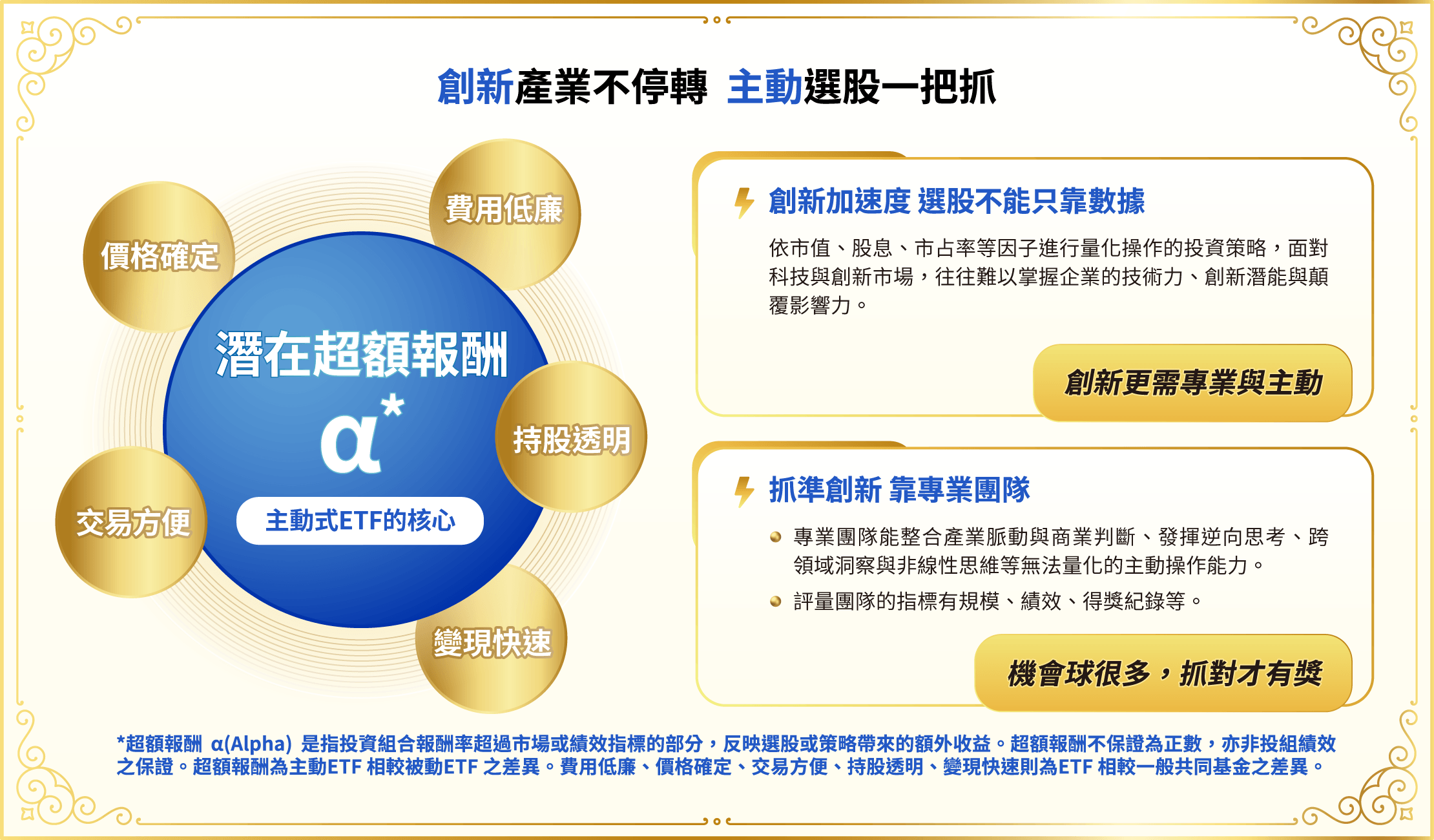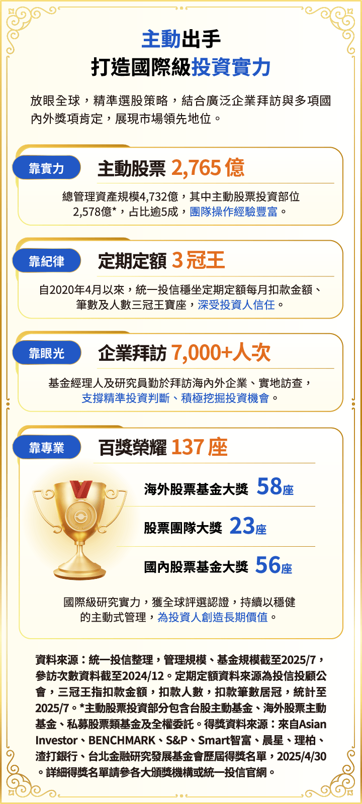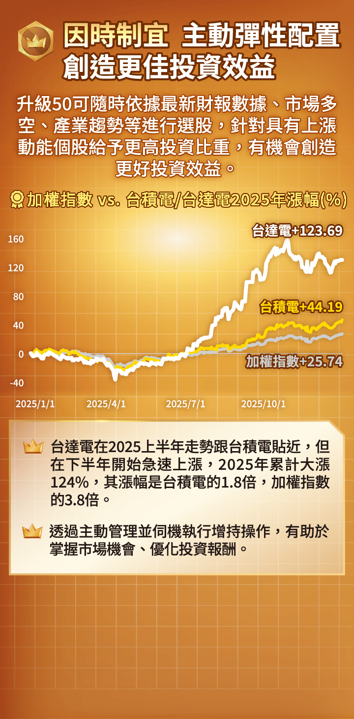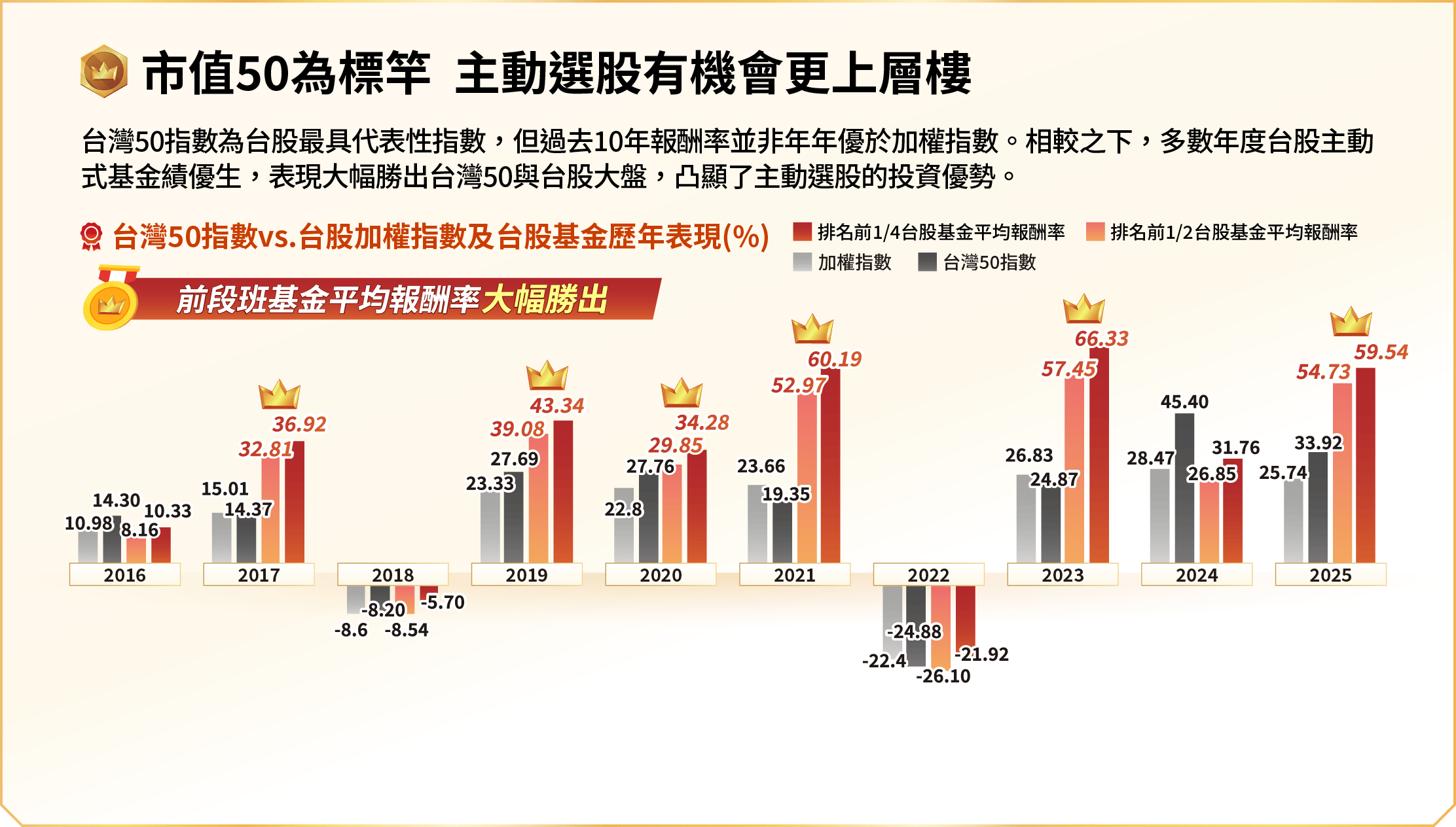 申購本基金係持有基金受益憑證,而非本文提及之投資資產或標的。基金不同於指數,基金可能發生中途清算或合併等情形,投資人無法直接投資指數。上述內容提及之歷史數據,不代表本基金之走勢及績效,本基金投資風險請詳閱基金公開說明書。資料來源:Bloomberg、晨星,皆為不含息報酬率,統一投信整理。本文所指之台灣50指數指富時臺灣證券交易所臺灣50指數,台股基金指在台灣核備的不分類所有台股主動基金主級別(不含ETF),前段班基金平均報酬率指當年度排名前1/2或前1/4的台股基金之平均報酬率。