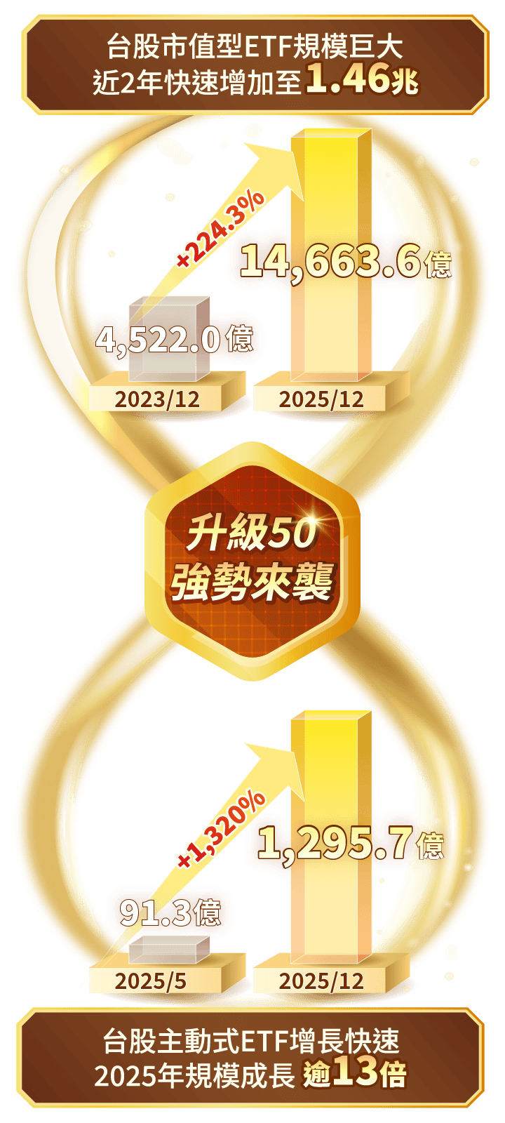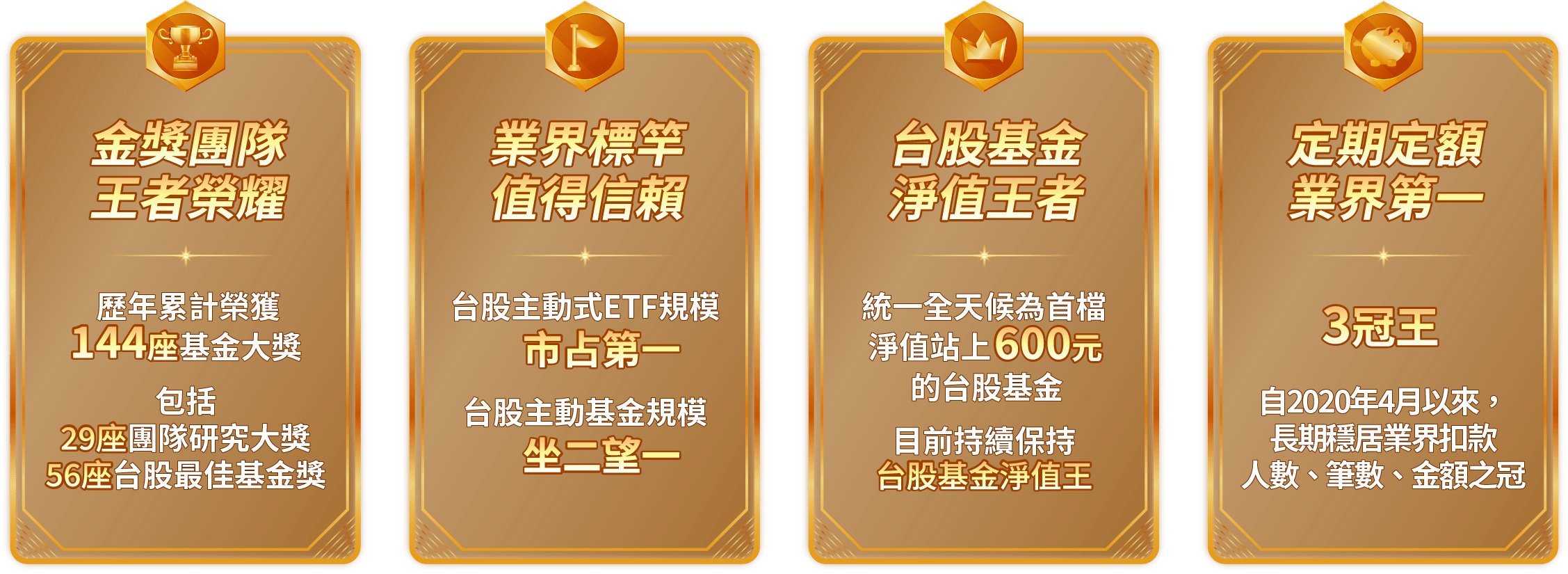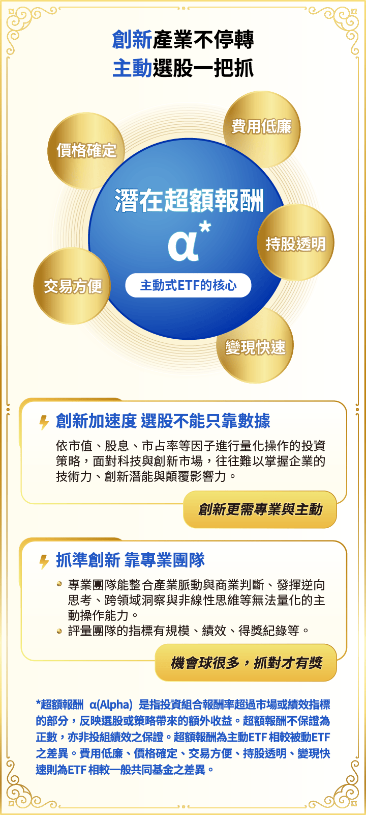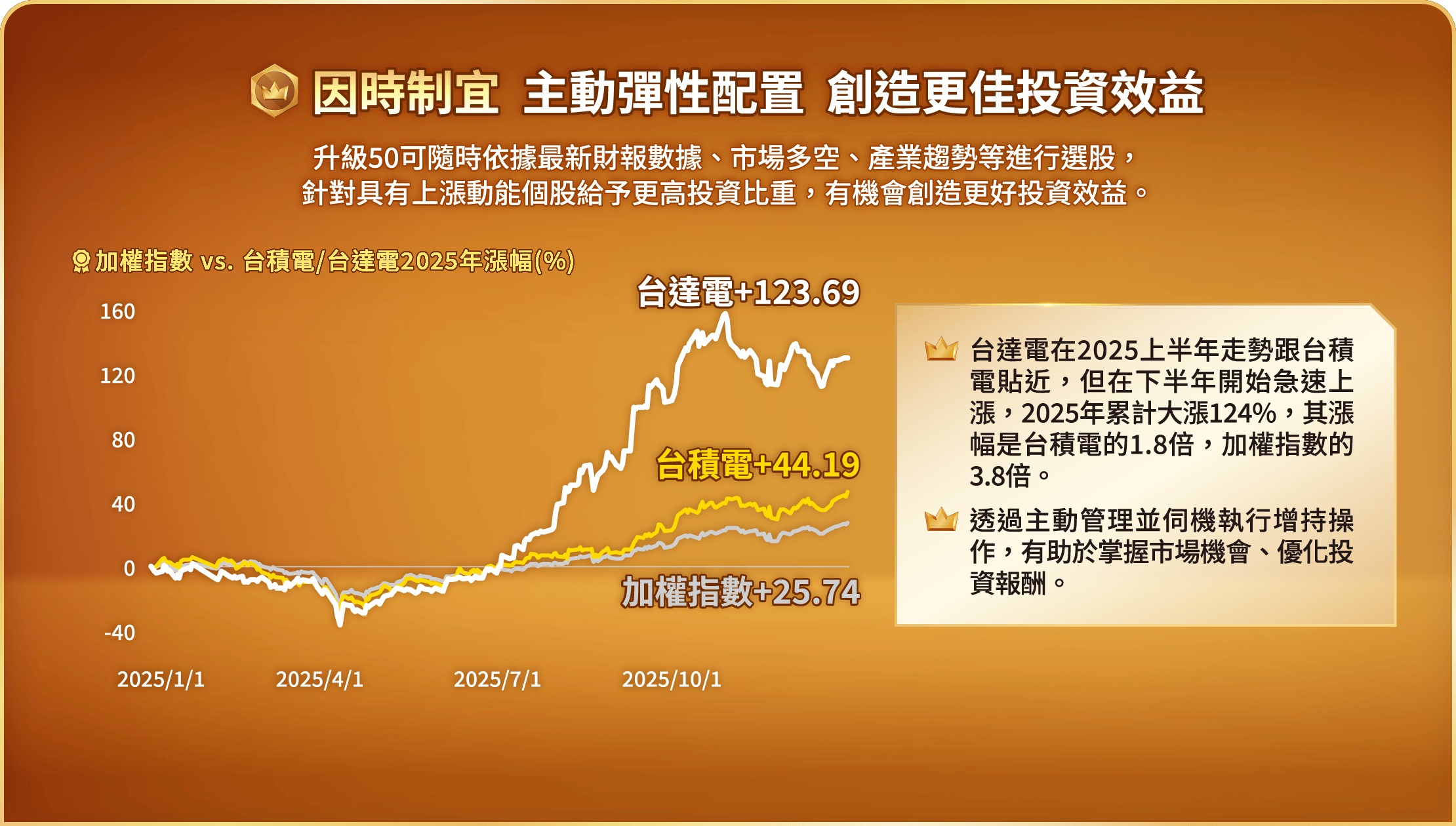 申購本基金係持有基金受益憑證,而非本文提及之投資資產或標的。基金不同於指數,基金可能發生中途清算或合併等情形,投資人無法直接投資指數。上述內容提及之歷史數據,不代表本基金之走勢及績效,本基金投資風險請詳閱基金公開說明書。資料來源:Bloomberg、晨星,皆為不含息報酬率,統一投信整理。本文所指之台灣50指數指富時臺灣證券交易所臺灣50指數,台股基金指在台灣核備的不分類所有台股主動基金主級別(不含ETF),前段班基金平均報酬率指當年度排名前1/2或前1/4的台股基金之平均報酬率。