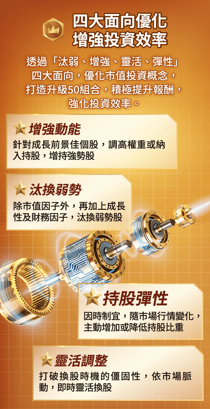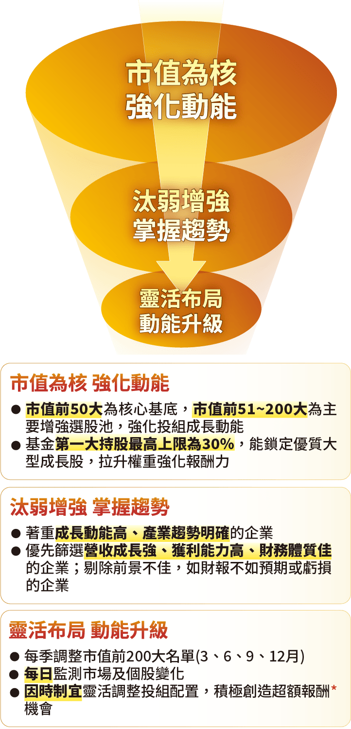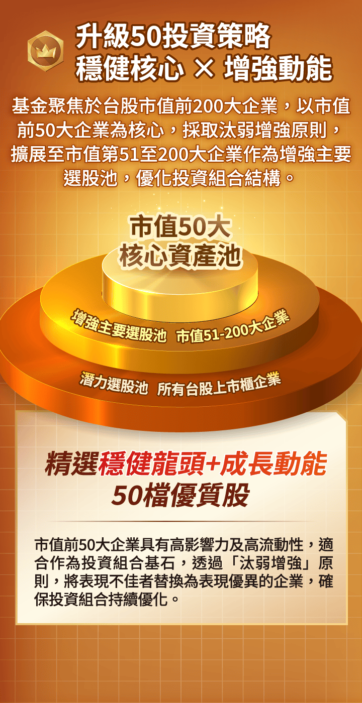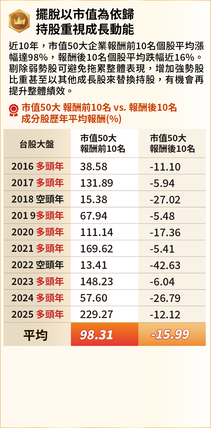 申購本基金係持有基金受益憑證,而非本文提及之投資資產或標的。基金不同於指數,基金可能發生中途清算或合併等情形,投資人無法直接投資指數。上述內容提及之歷史數據,不代表本基金之走勢及績效,本基金投資風險請詳閱基金公開說明書。資料來源:CMoney,統一投信整理。市值50大企業以上市櫃每年底之市值排序,並計算當年度的漲跌幅,皆為不含息報酬率。