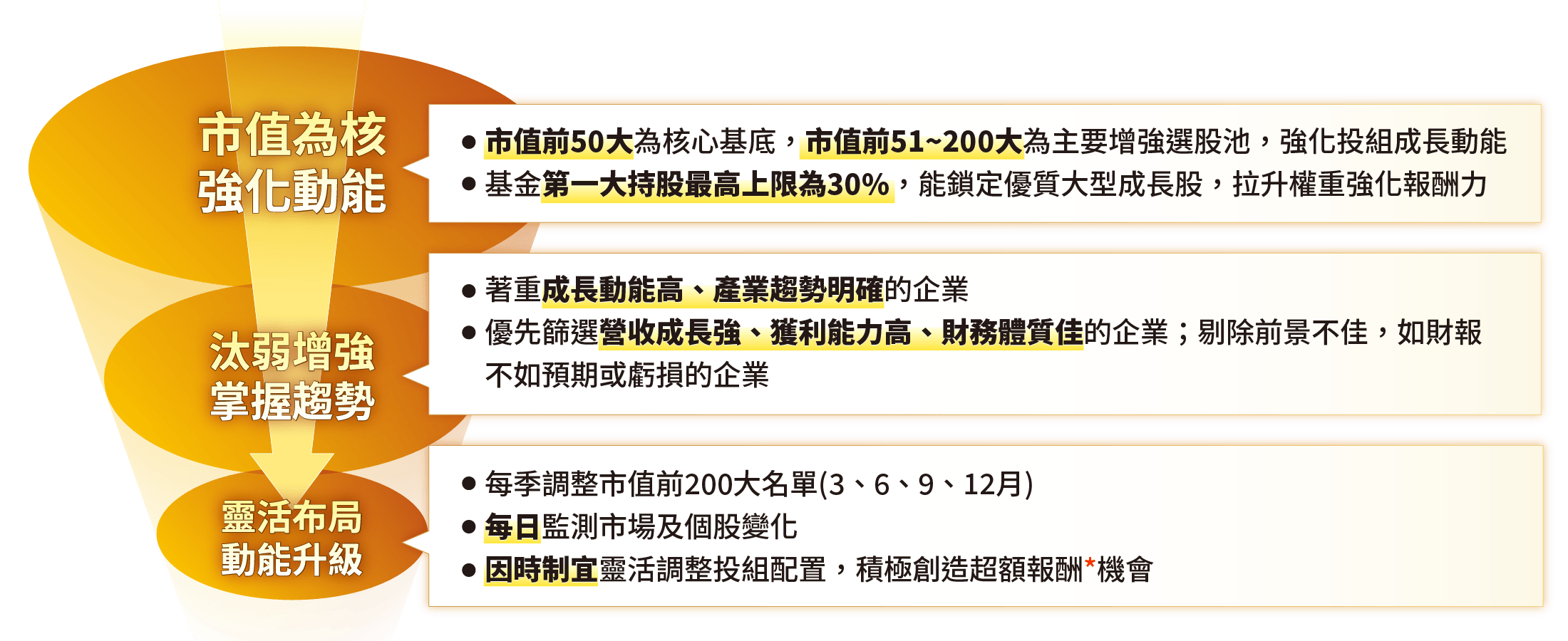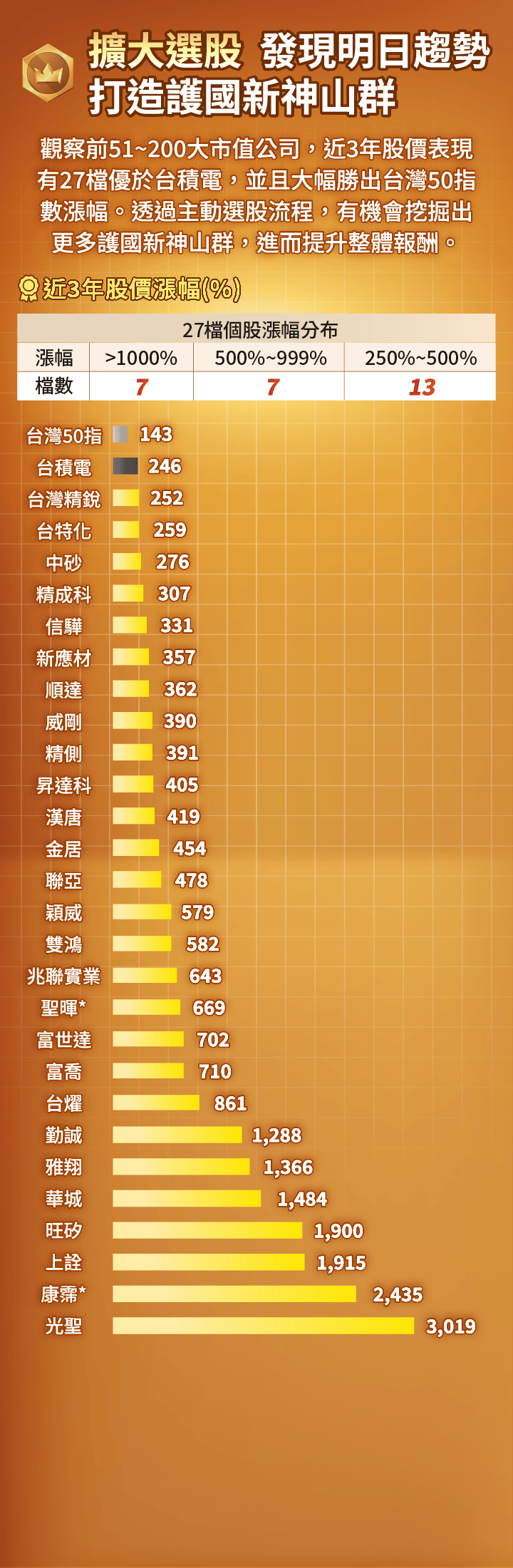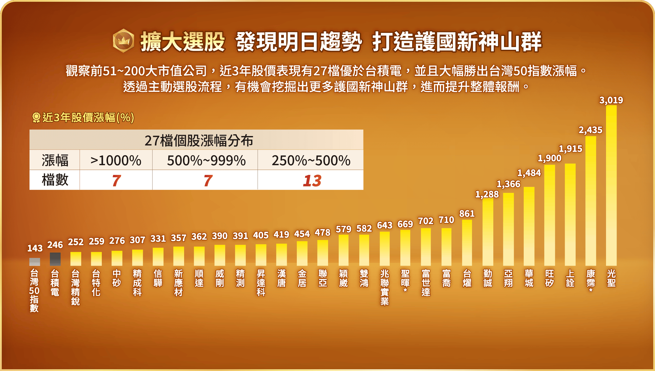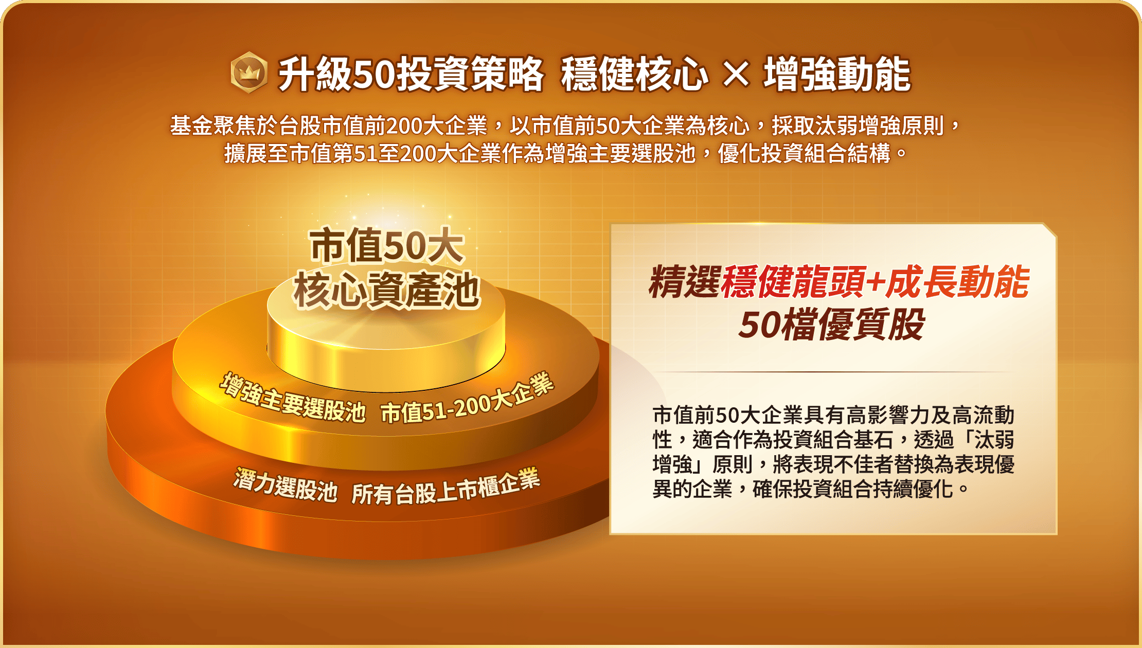 申購本基金係持有基金受益憑證,而非本文提及之投資資產或標的。基金不同於指數,基金可能發生中途清算或合併等情形,投資人無法直接投資指數。上述內容提及之歷史數據,不代表本基金之走勢及績效,本基金投資風險請詳閱基金公開說明書。資料來源:CMoney,統一投信整理。市值50大企業以上市櫃每年底之市值排序,並計算當年度的漲跌幅,皆為不含息報酬率。