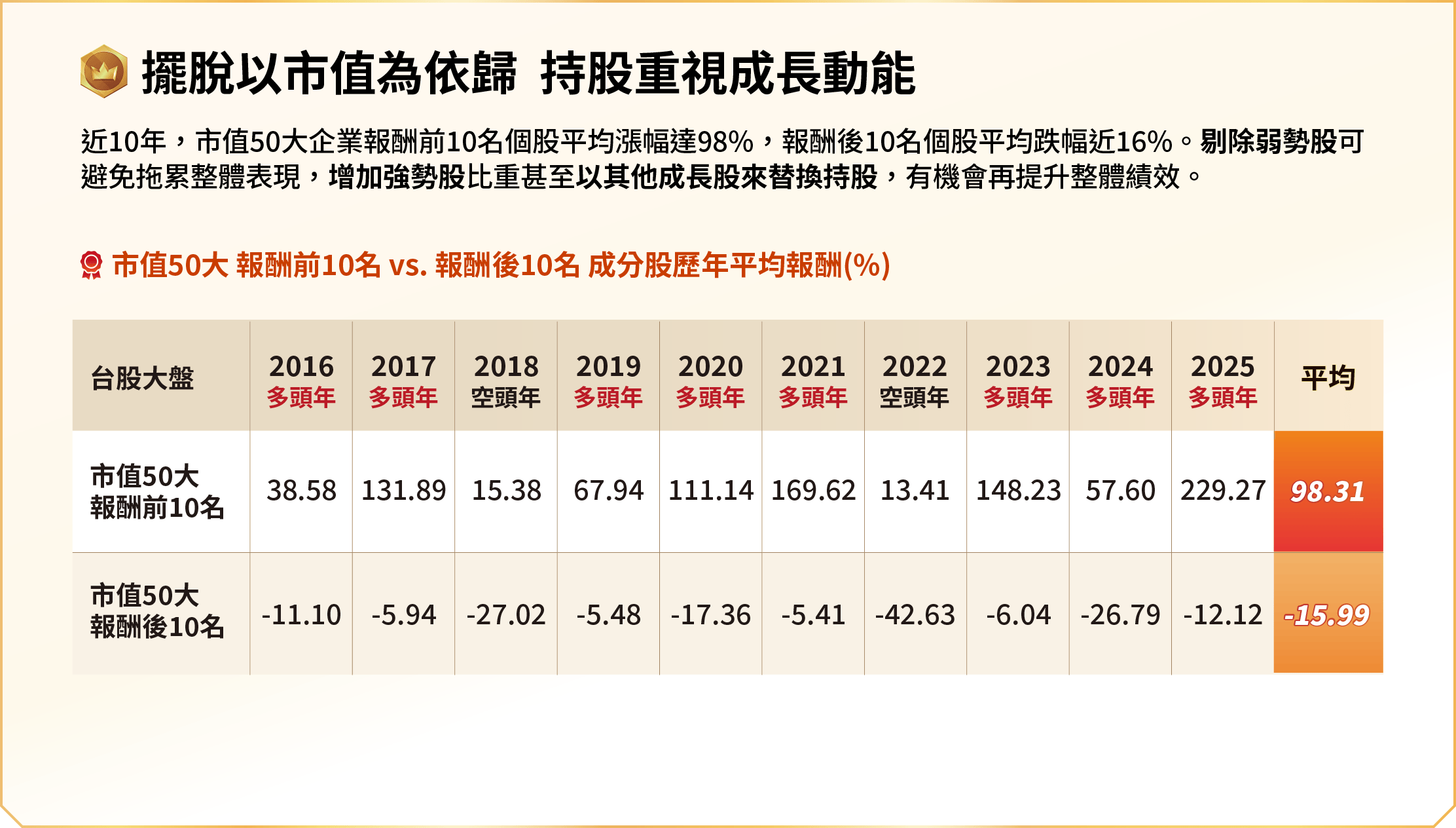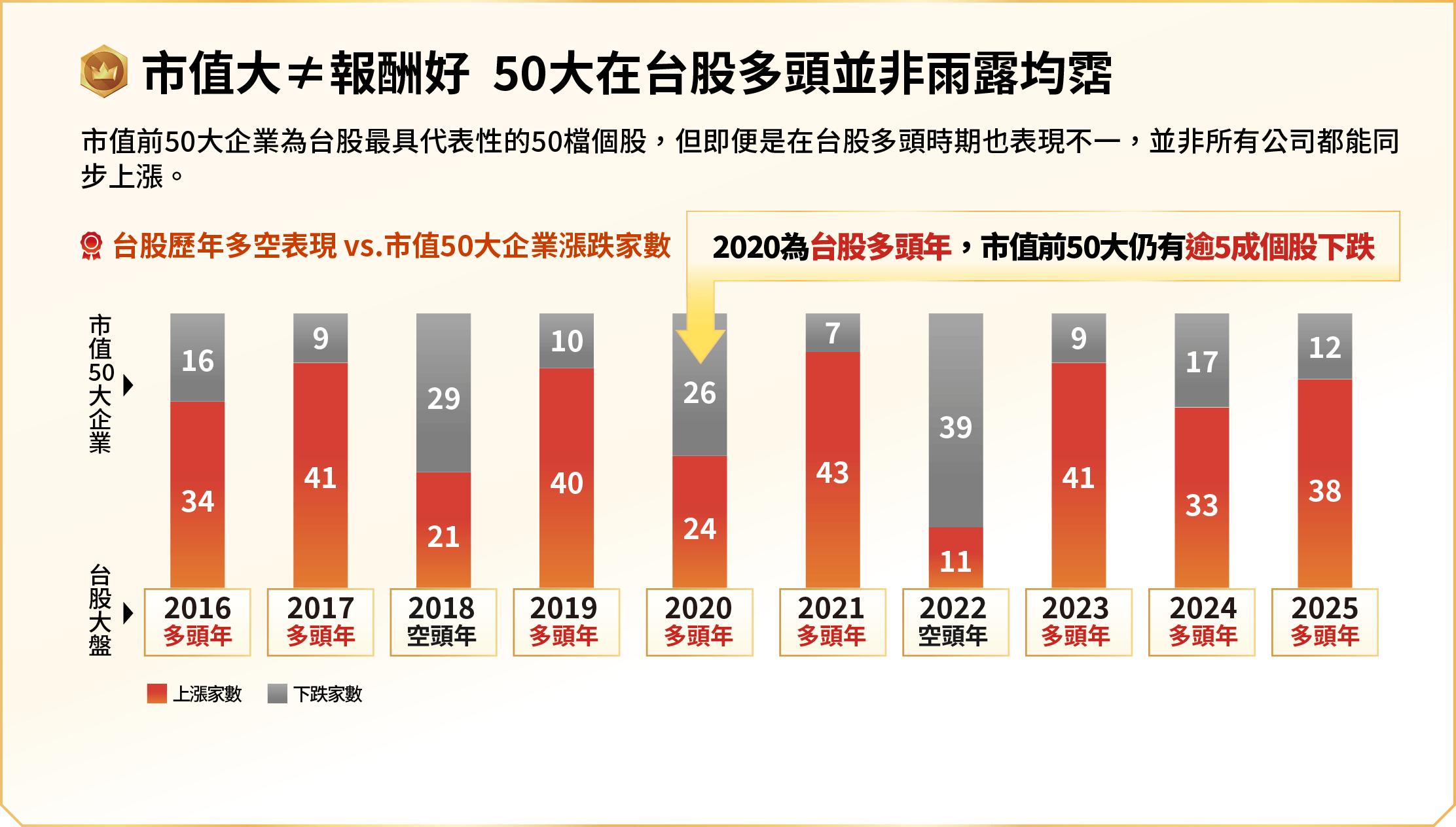 申購本基金係持有基金受益憑證,而非本文提及之投資資產或標的。基金不同於指數,基金可能發生中途清算或合併等情形,投資人無法直接投資指數。上述內容提及之歷史數據,不代表本基金之走勢及績效,本基金投資風險請詳閱基金公開說明書。資料來源:CMoney,統一投信整理。市值50大企業以上市櫃每年底之市值排序,並計算當年度的漲跌幅家數,台股大盤多空年以台股加權指數當年度漲跌幅認定,皆為不含息報酬率。