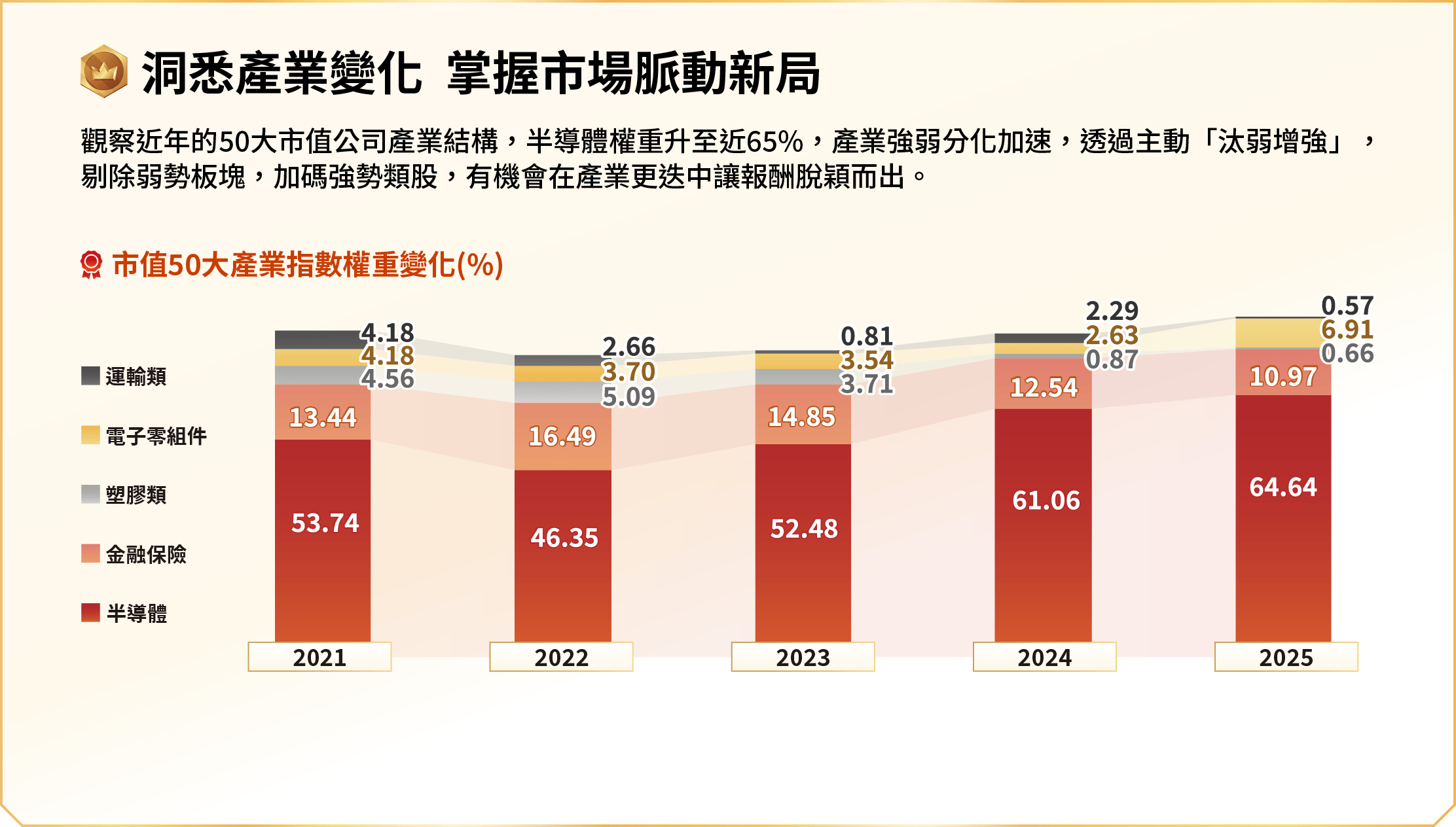 申購本基金係持有基金受益憑證,而非本文提及之投資資產或標的。基金不同於指數,基金可能發生中途清算或合併等情形,投資人無法直接投資指數。上述內容提及之歷史數據,不代表本基金之走勢及績效,本基金投資風險請詳閱基金公開說明書。資料來源:CMoney,統一投信整理。市值50大企業以上市櫃每年底之市值排序,並以此計算各年底的產業指數權重比例,並以2021年底的前5大產業指數作為基準,觀察後續幾年的權重變化。