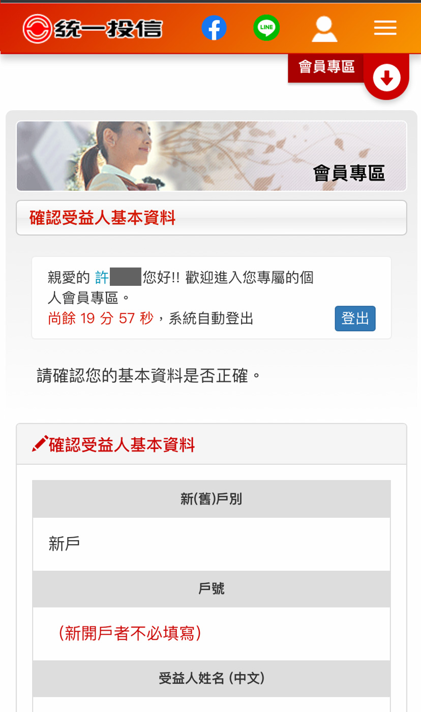 填寫您的基本資料,此部分會以您之前於會員申請資料帶入。戶籍資料請留意務必與身分證一致,若遇空白欄位,請以拉霸選取【空白】,資料填寫完成後點選【確認送出】。